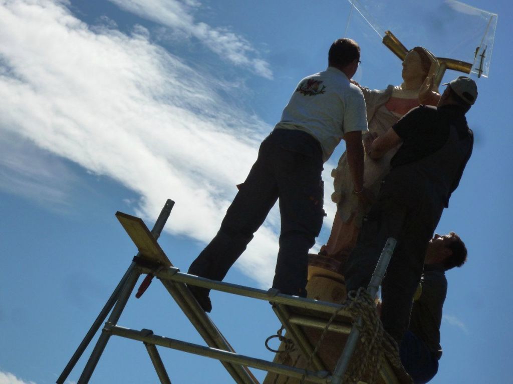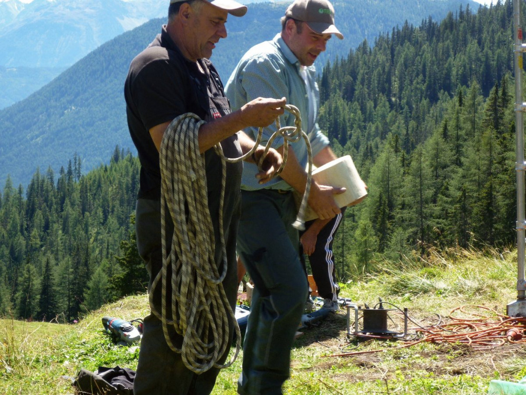 Dann ging alles sehr schnell. Beim Aufrichten der Mariensäule halfen unter anderem Bildhauer Siegfried Krismer, Architekt Markus Illmer, Almhirt Herbert Schuchter, Almbauer Max Pirpamer, Charly Haselwanter, Almbauer Hansjörg Wett und Almobmann Benedikt van Staa.