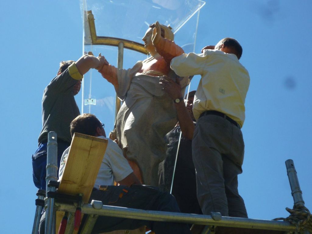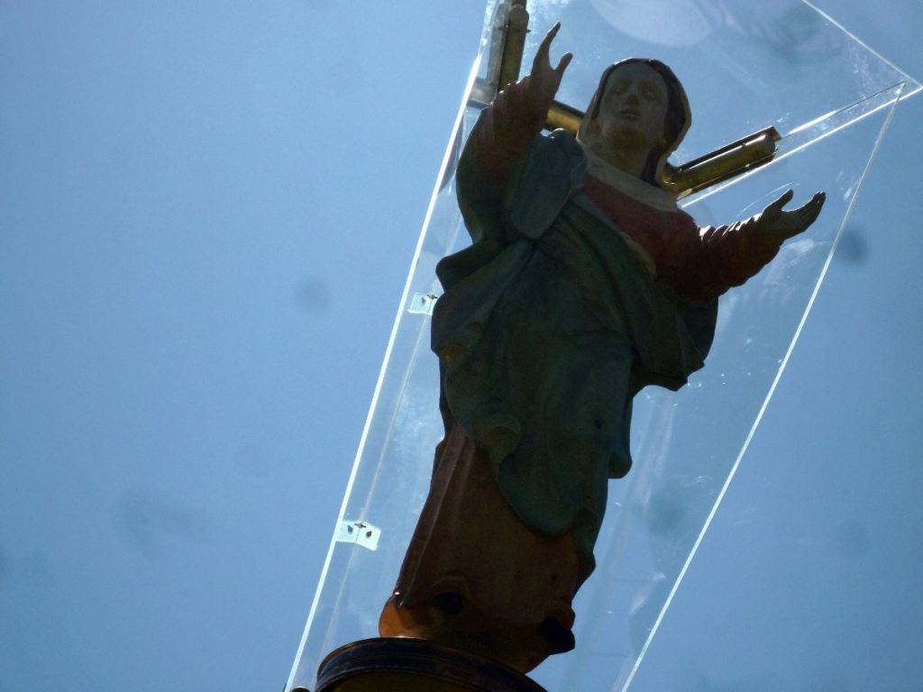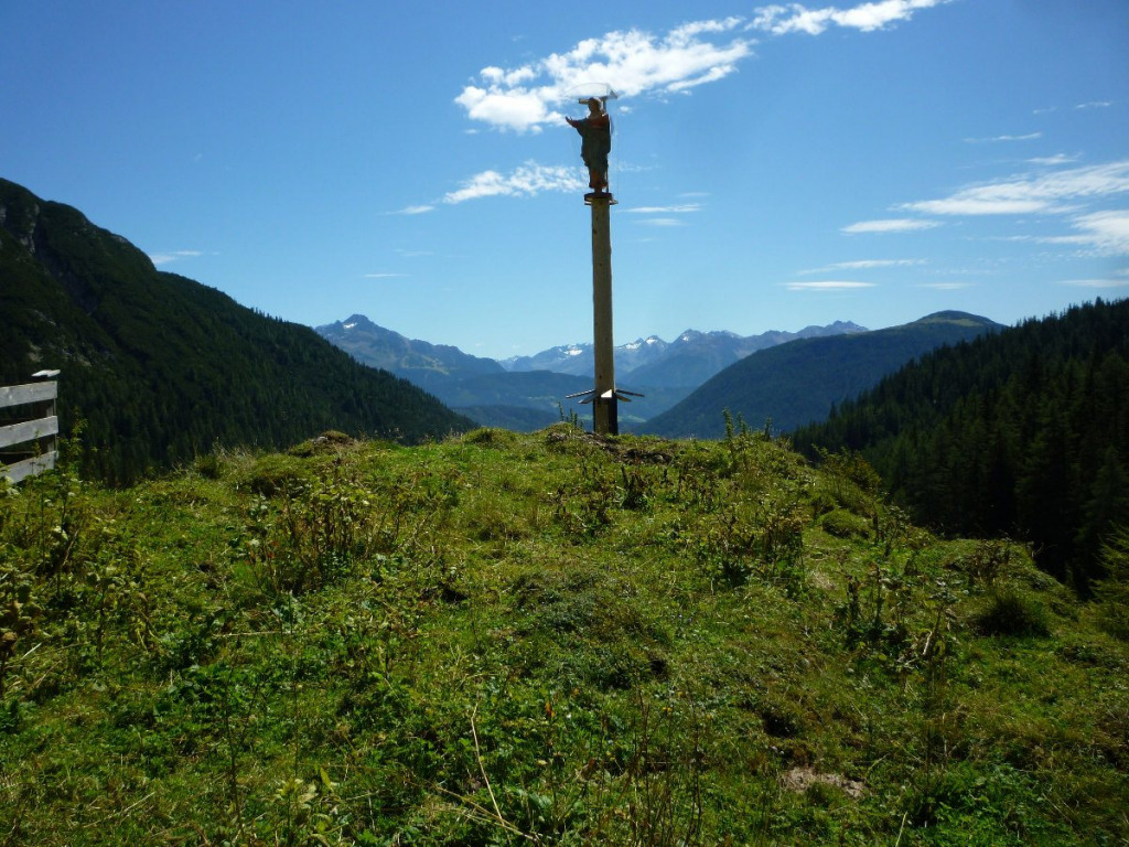 Die neue Marienstatue wurde im Auftrag der Agrargemeinschaft Marienbergalpe vom Bildhauer Siegfried Krismer geschnitzt. Wir waren Gäste beim Holzschnitzer in Fiss. Das Aufstellen der Mariensäule glich nur wenig später einem kleinen Bergfest.