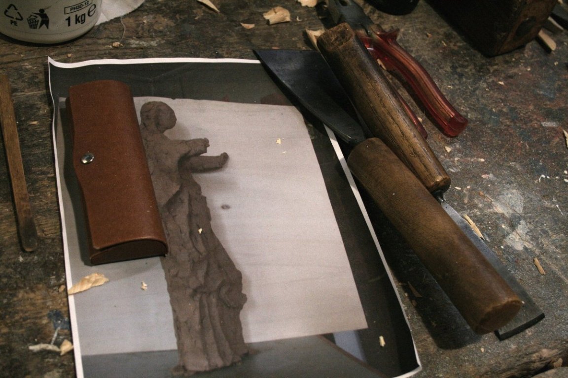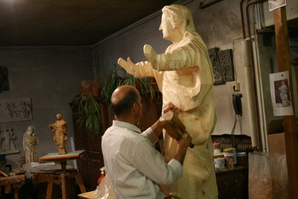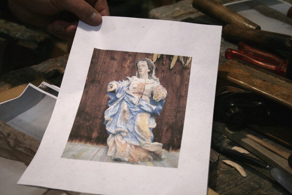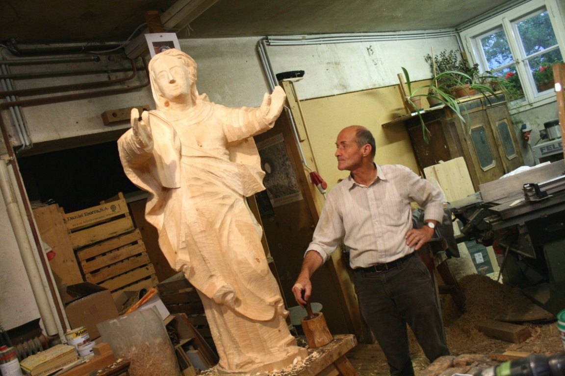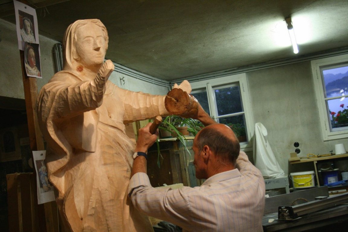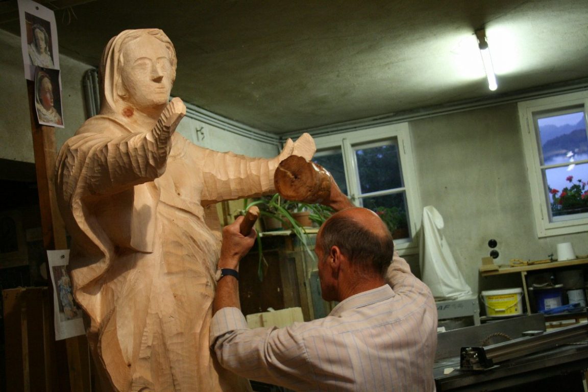 Bei unserem Besuch dürfen wir dem Bildhauer über die Schultern schauen und miterleben, wie die Marienstatue ihren Feinschliff erhält.