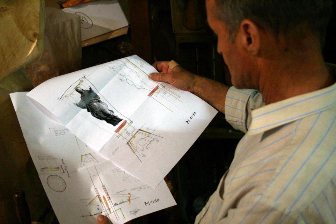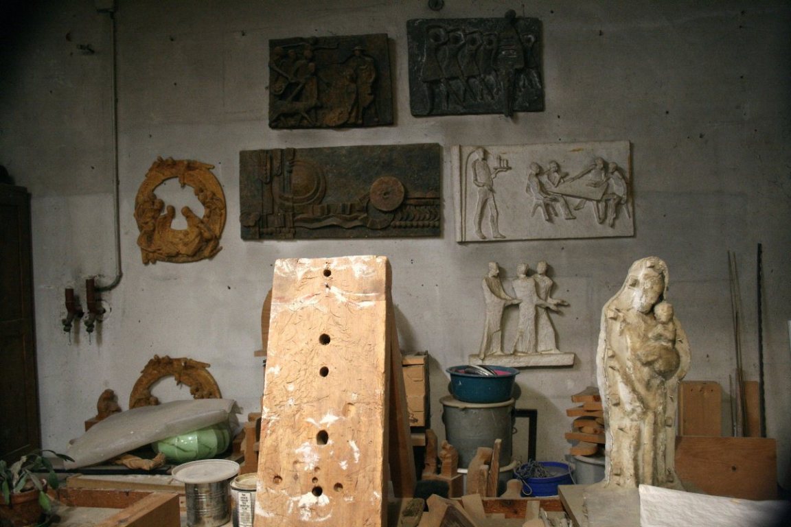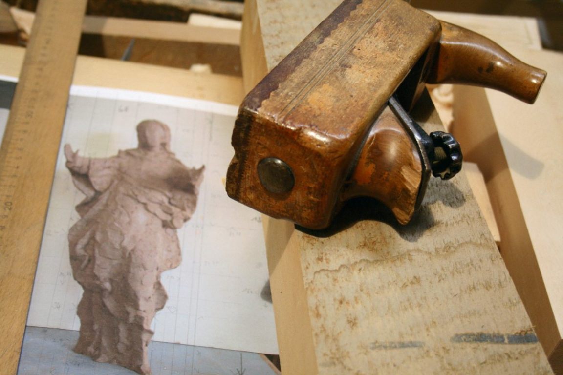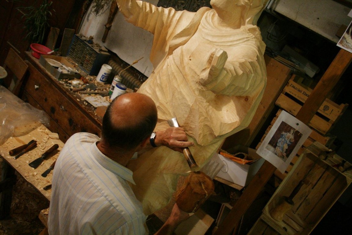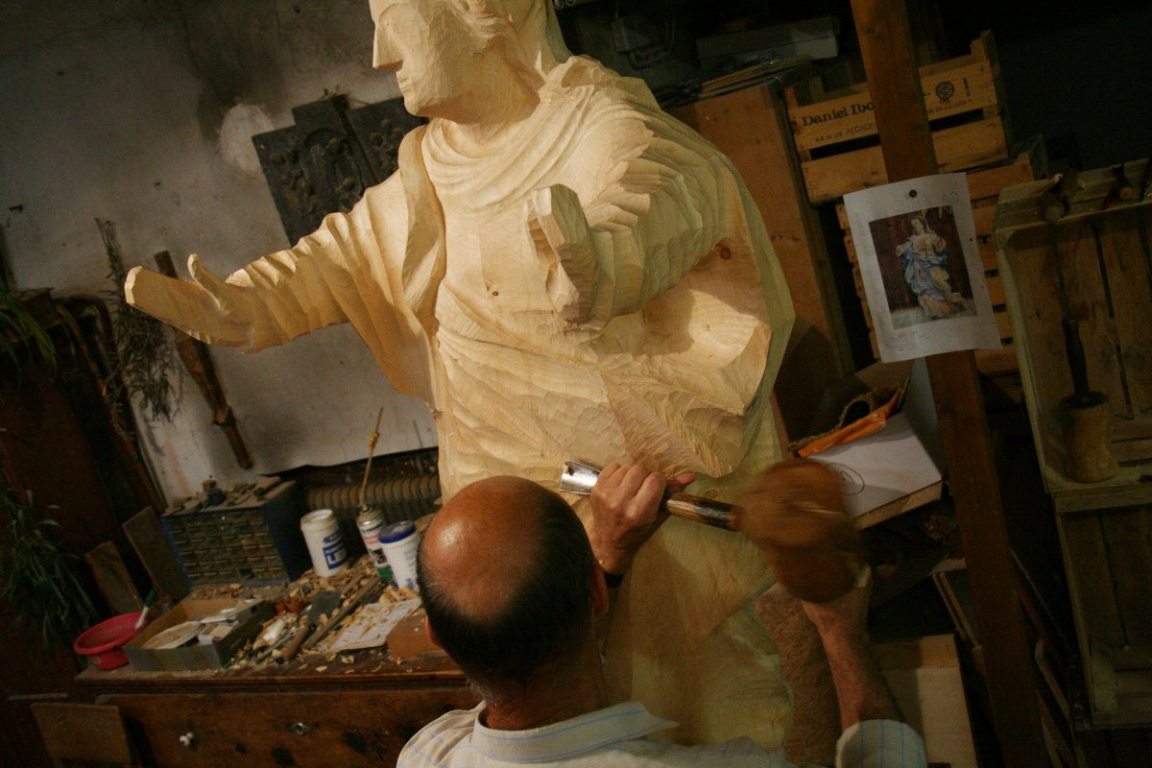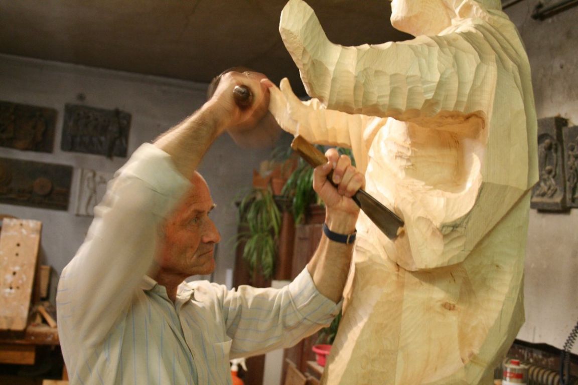 Bei unserem Besuch dürfen wir dem Bildhauer über die Schultern schauen und miterleben, wie die Marienstatue ihren Feinschliff erhält.