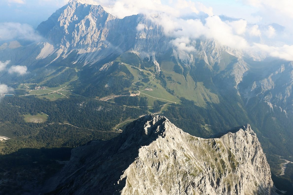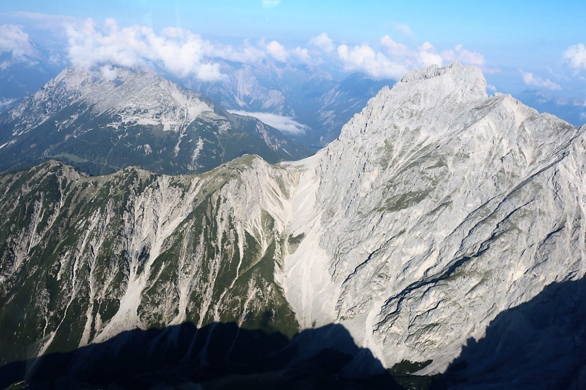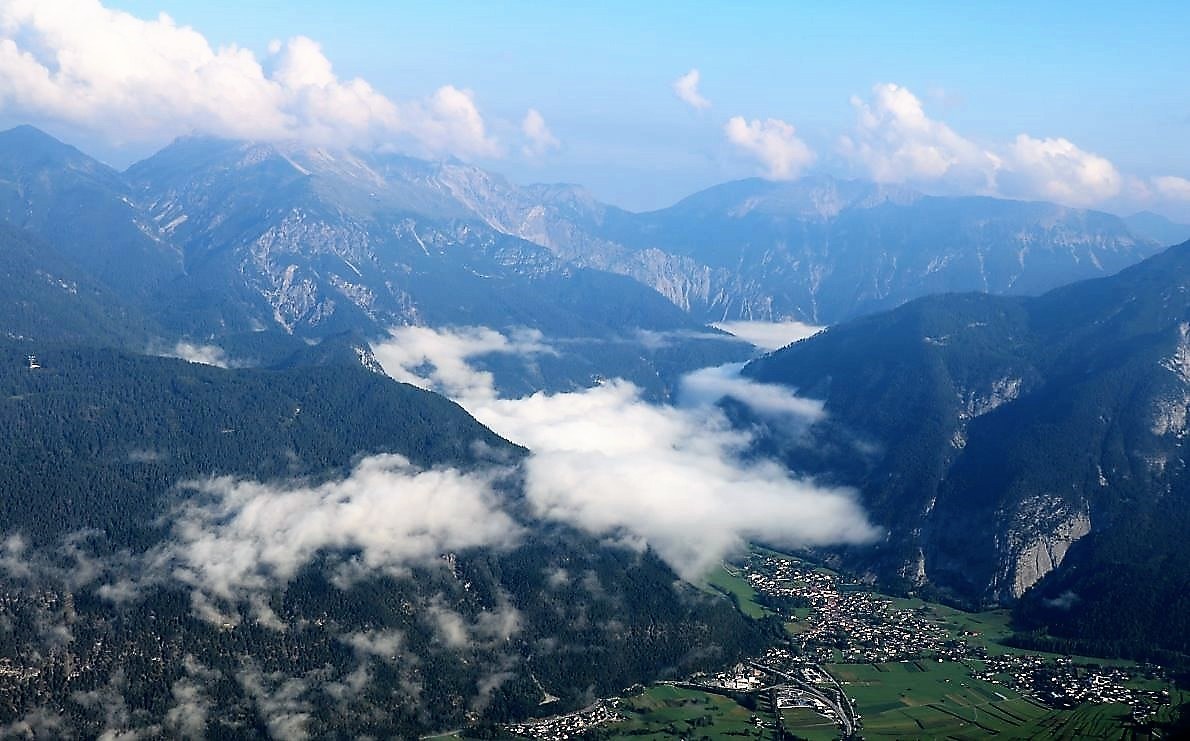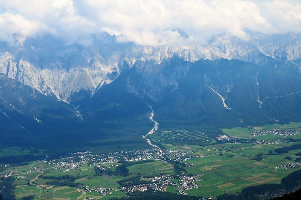 Jetzt sehen wir das Mieminger Almenland nur aus der Ferne. Beim Überflug über die Nordtiroler Alpen liegt unter uns das Mieminger Plateau. Alles scheint zum Greifen nah.