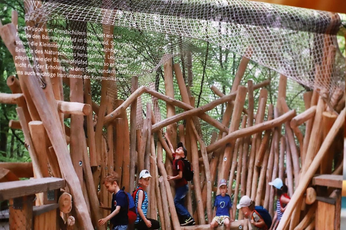 An insgesamt neun Bäumen erfahren Ausstellungsbesucherinnen und -besucher, wie man den Staatswald in Bayern nachhaltig bewirtschaftet und die damit zusammenhängende Themenvielfalt (Details: Wertewald, Bayerische Staatsforsten).