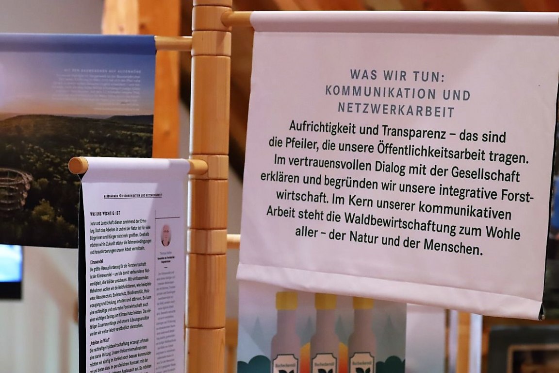 Grafisch ansprechend gestaltet, werden über die „Bäume“ der Ausstellung forstwirtschaftliche Ziele formuliert. Über allem steht das Miteinander und eine klimagerechte Zukunftsentwicklung des Waldes. So sie vom Menschen beeinflussbar sind.