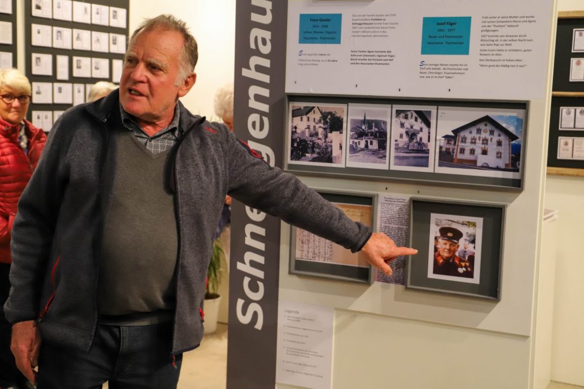 Chronist Toni Riser steht vor der Tafel „Schneggenhausen“ und erklärt seinem interessierten Publikum, welche Berühmtheiten darauf präsentiert werden. „Schaut mal hier, das ist das Bild unseres früheren Postmeisters Josef Föger.“ Die Heimatzeitung schrieb seinerzeit, etwas Vergleichbares wie sein Begräbnis habe man noch nie zuvor in Obsteig erlebt. Da waren alle da. Mit und ohne Rang.
