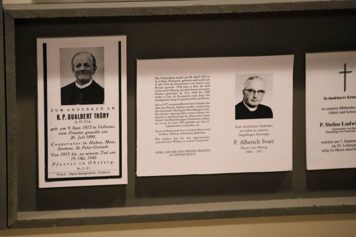 Mit der Ausstellung sollen Menschen geehrt werden, die in der Tiroler Gemeinde Obsteig Spuren hinterlassen haben. Unterschiedliche Tafeln setzten Akzente. In Sterbejahren organisiert und gewidmet. Im speziellen dem Larchhof, der Burg Klamm, Schneggenhausen, dem Fremdenverkehr, populären Wirtshäusern und engagierten Frauen.
