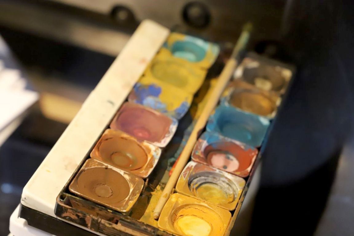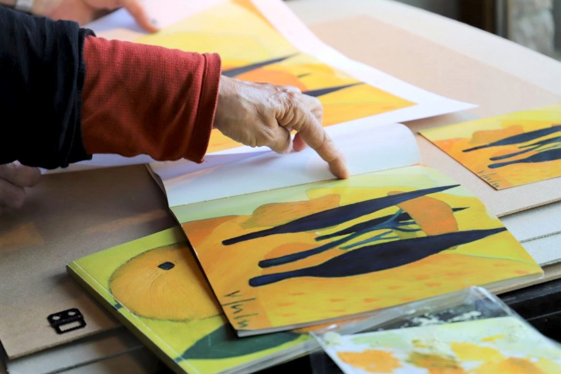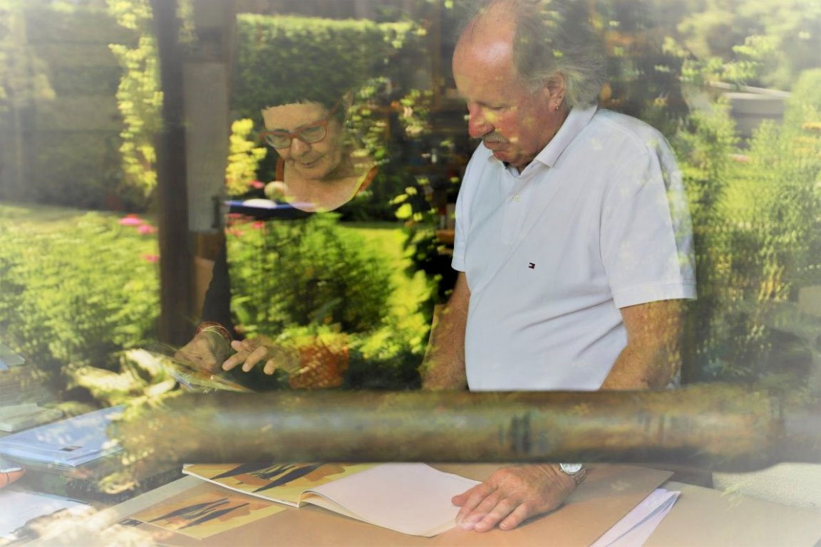 Der Steindrucker hält eine Palette mit Ölfarben in seiner Hand. Die Grundtöne sind überwiegend gelb. Wenn Günther Stecher und Veronika Gerber passende Farben für eine neue Lithographie aussuchen, fühlt man ihre Nähe zueinander. Fachlich wie menschlich.