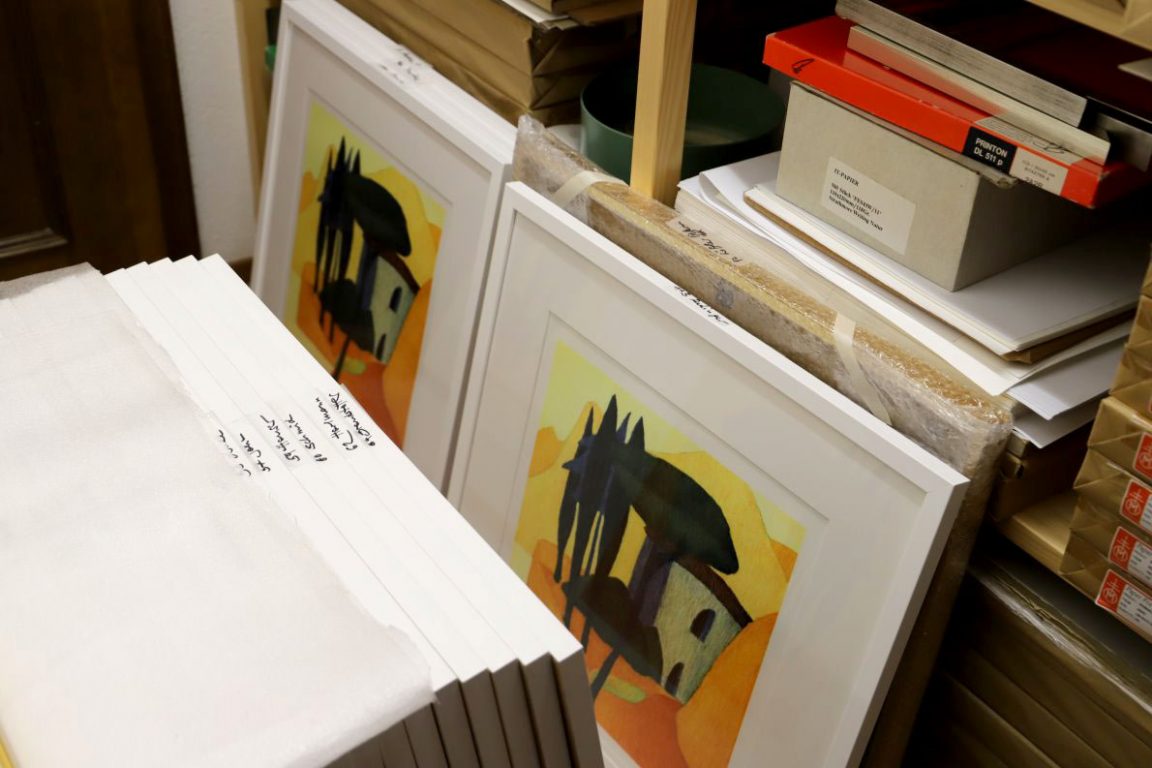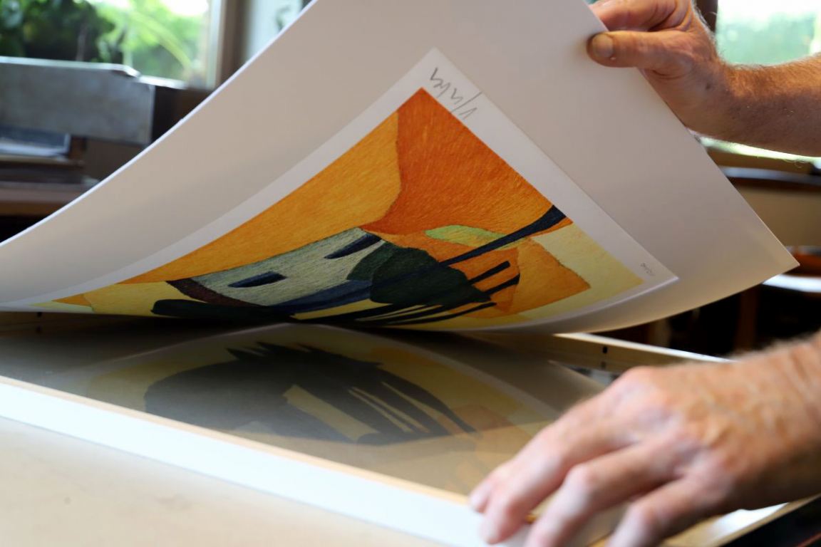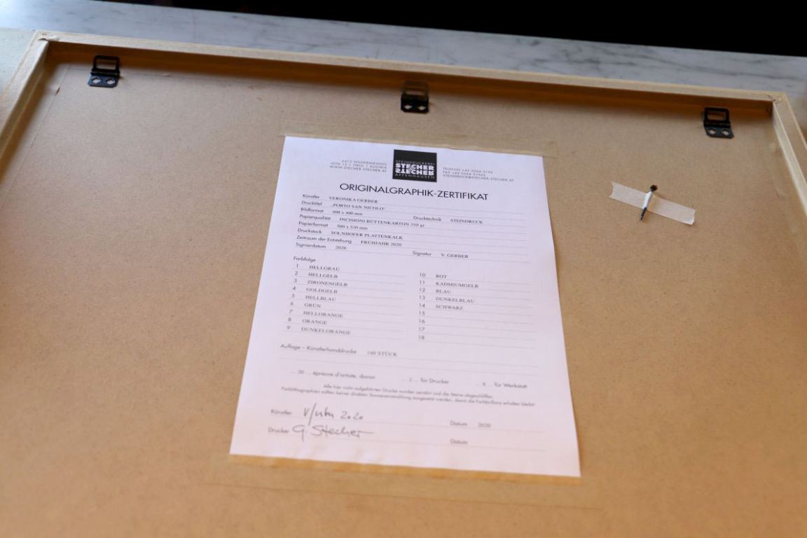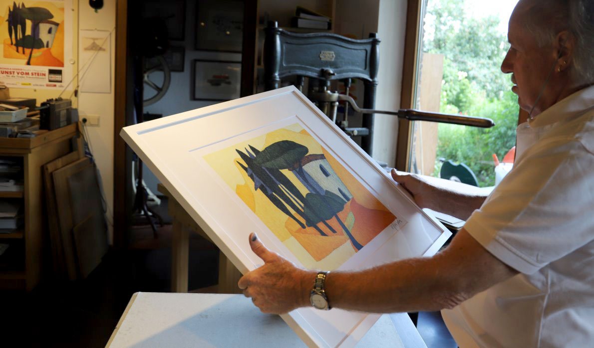 Wie nebenbei beschäftigt sich Günther Stecher mit dem Rahmen der letzten Afra-Lithographie von Veronika Gerber. „Porto San Nicolo“ wurde von ihr im Frühjahr auf 14 Steinen gemalt. Die limitierte Gesamtauflage von 140 Exemplaren war in nur wenigen Tagen ausverkauft.