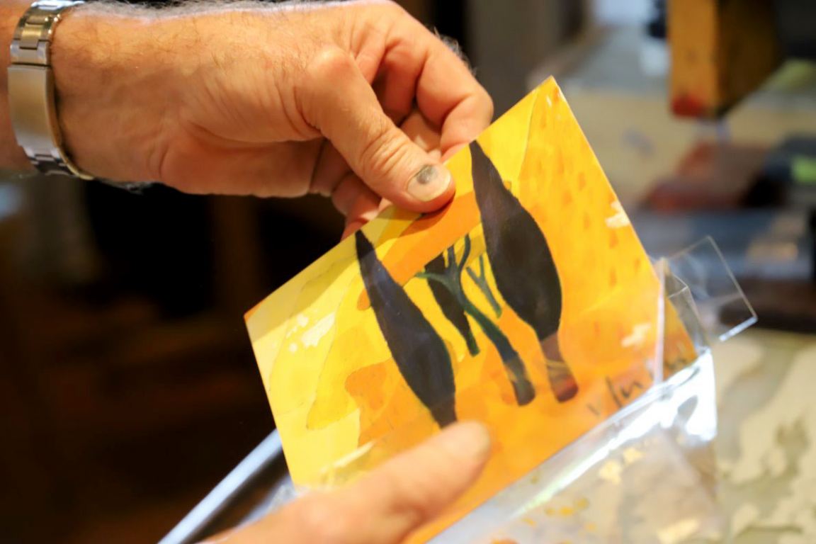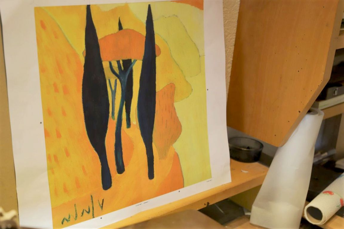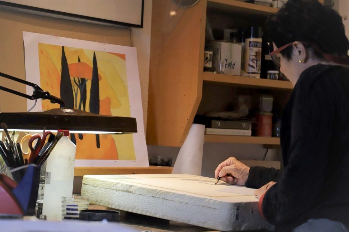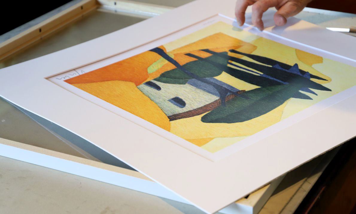 Wie nebenbei beschäftigt sich Günther Stecher mit dem Rahmen der letzten Afra-Lithographie von Veronika Gerber. „Porto San Nicolo“ wurde von ihr im Frühjahr auf 14 Steinen gemalt. Die limitierte Gesamtauflage von 140 Exemplaren war in nur wenigen Tagen ausverkauft.