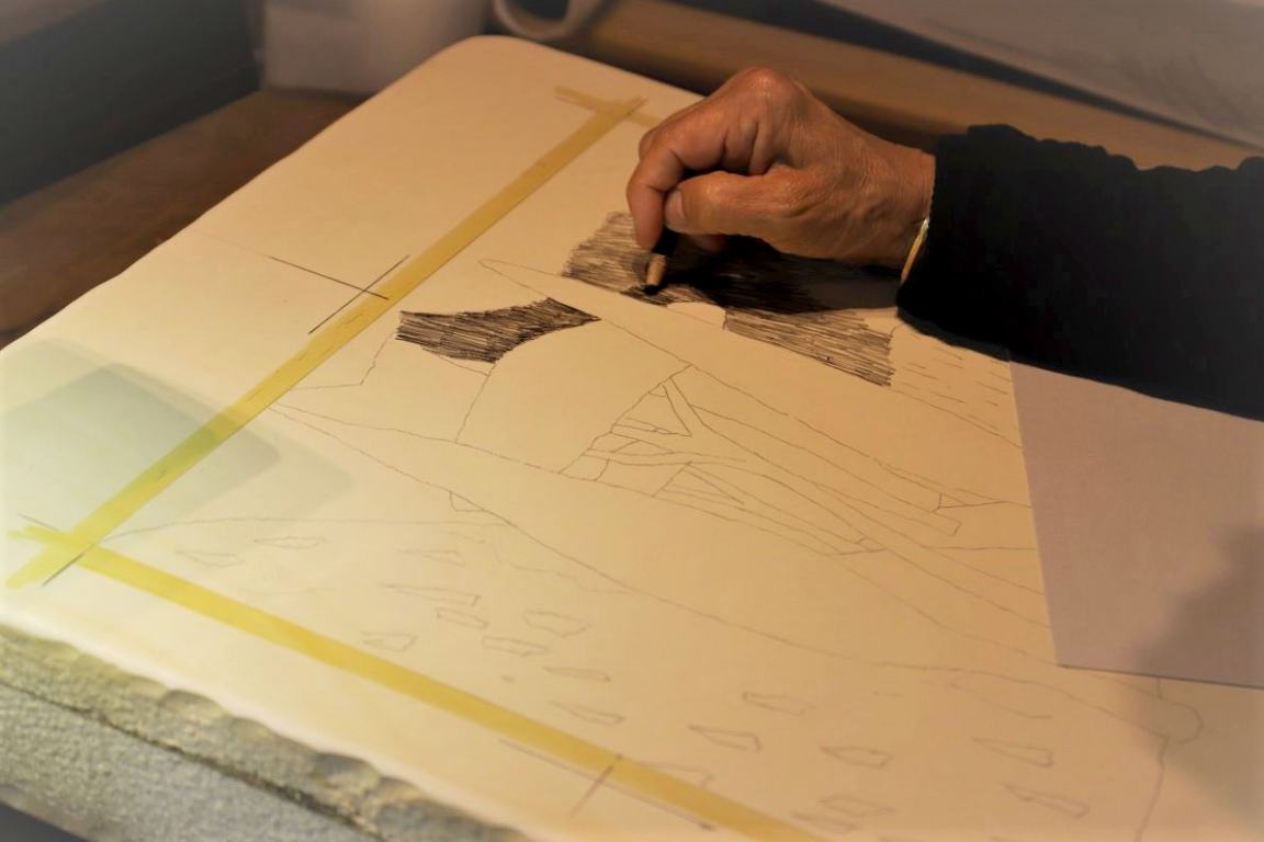 Beim Erzählen schaut die Künstlerin auf ihre Vorlage und zeichnet mit dem Kreidestift dunkle Schraffuren auf den Kalkstein.