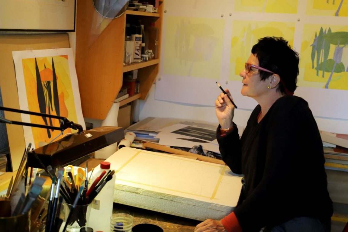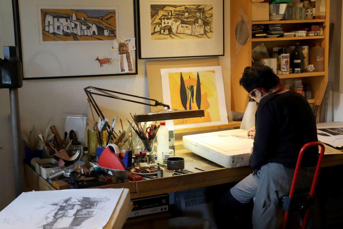 Von der Afra-Benefiz-Lithographie „Porto San Nicolo“ stehen 140 gerahmte Bilder abholbereit im Keller der Steindrucker in Affenhausen. Im Atelier arbeitet Veronika Gerber an ihrer neuen Lithographie am Stein. Am liebsten hört sie dabei Mozarts Klavierkonzerte.