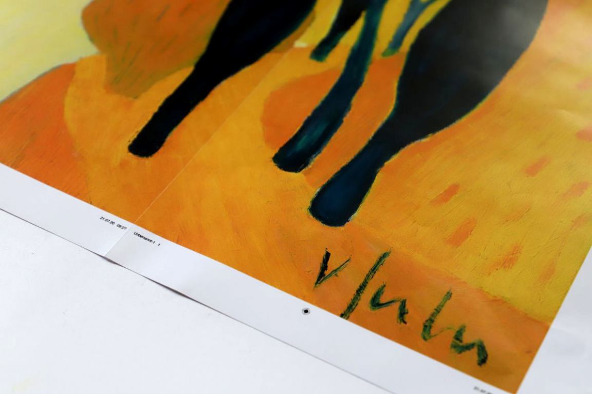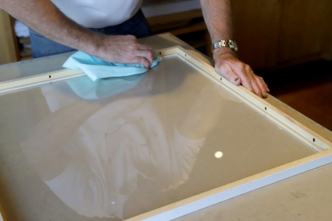 „Das ist das berühmte Mehr an Schlagobers auf der Melange“, scherzt der Steindrucker. Er hält die gerahmte Lithographie gegen das Licht und prüft, ob noch irgendwo eine unsaubere Stelle zu sehen ist. Dann wird der Rahmen wieder geöffnet, alles noch einmal gründlich gereinigt. Fertig. “Solange, bis es passt.”