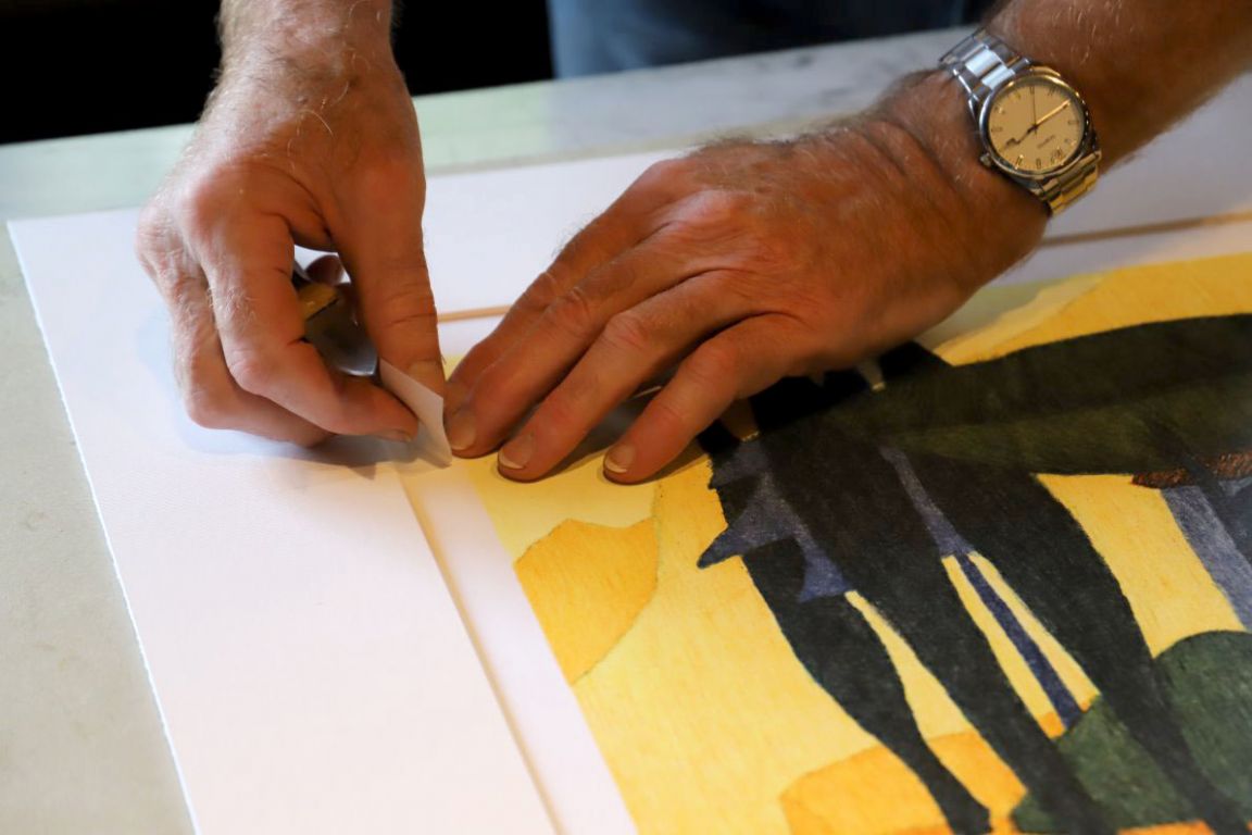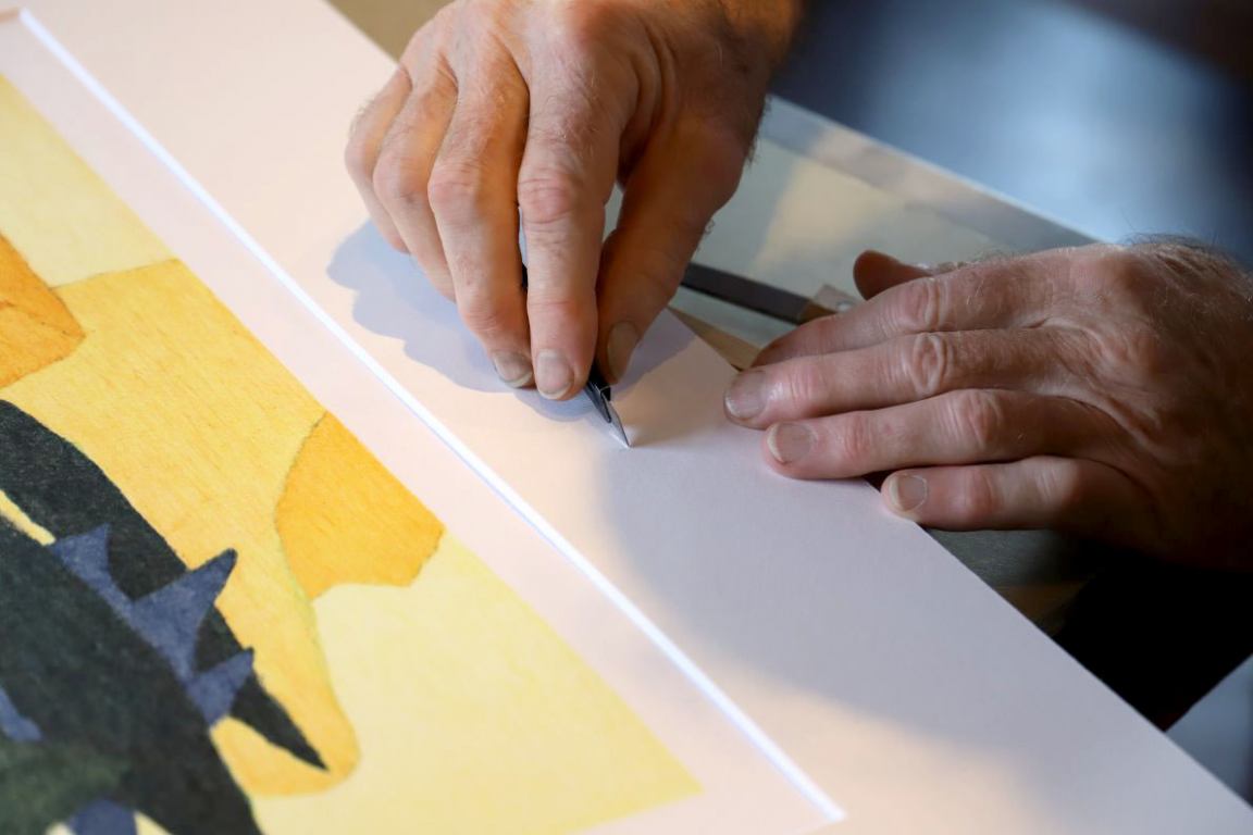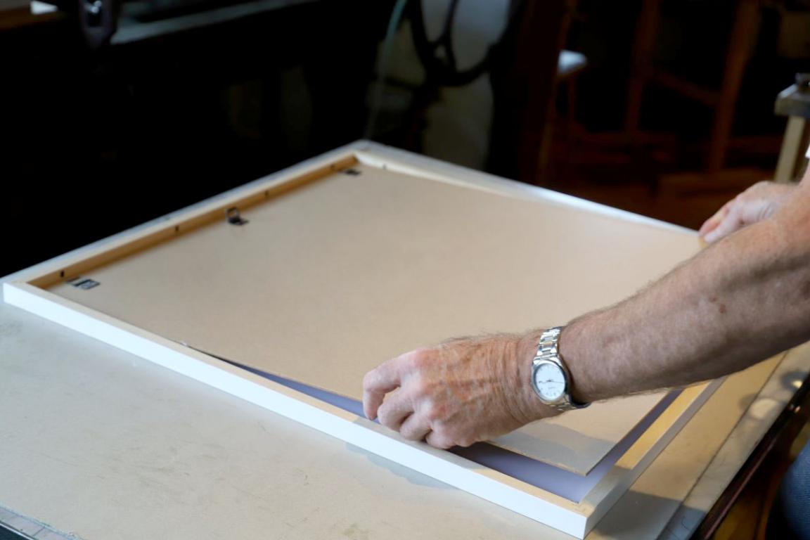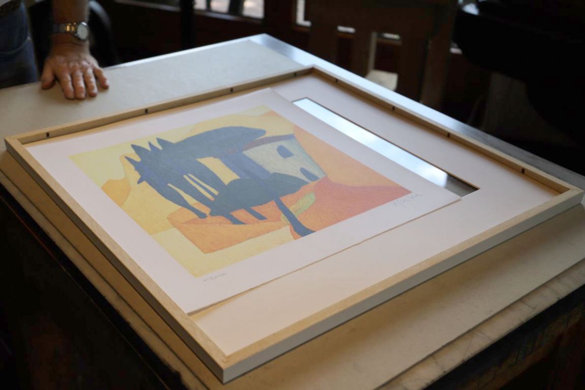 In den Auer’schen Rahmen legt er ein Passepartout und die aktuelle Afra-Lithographie. Er verklebt das Bild mit einem Schutzblatt und dem Zertifikat, unterzeichnet von Veronika Gerber und ihm, dem Steindrucker Günther Stecher. Zum Schluss wird noch ein Nagel fürs Aufhängen eingeklebt.