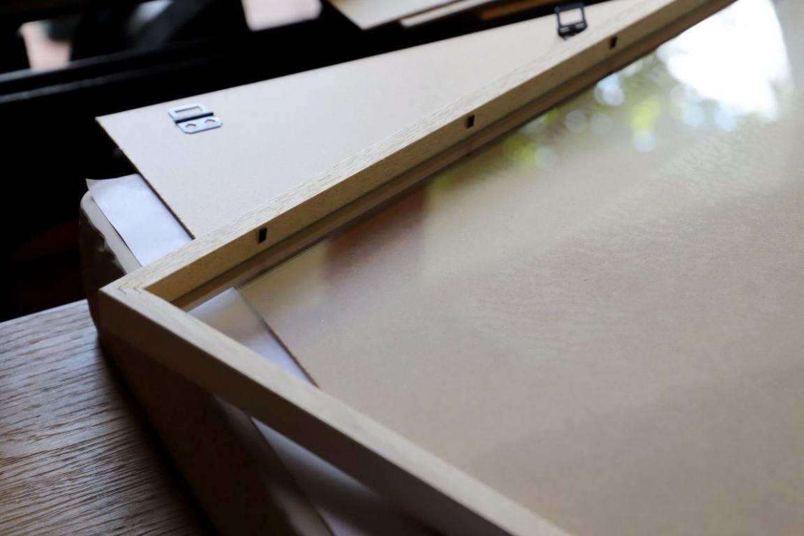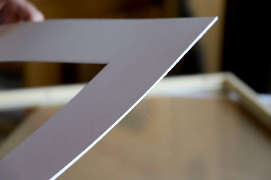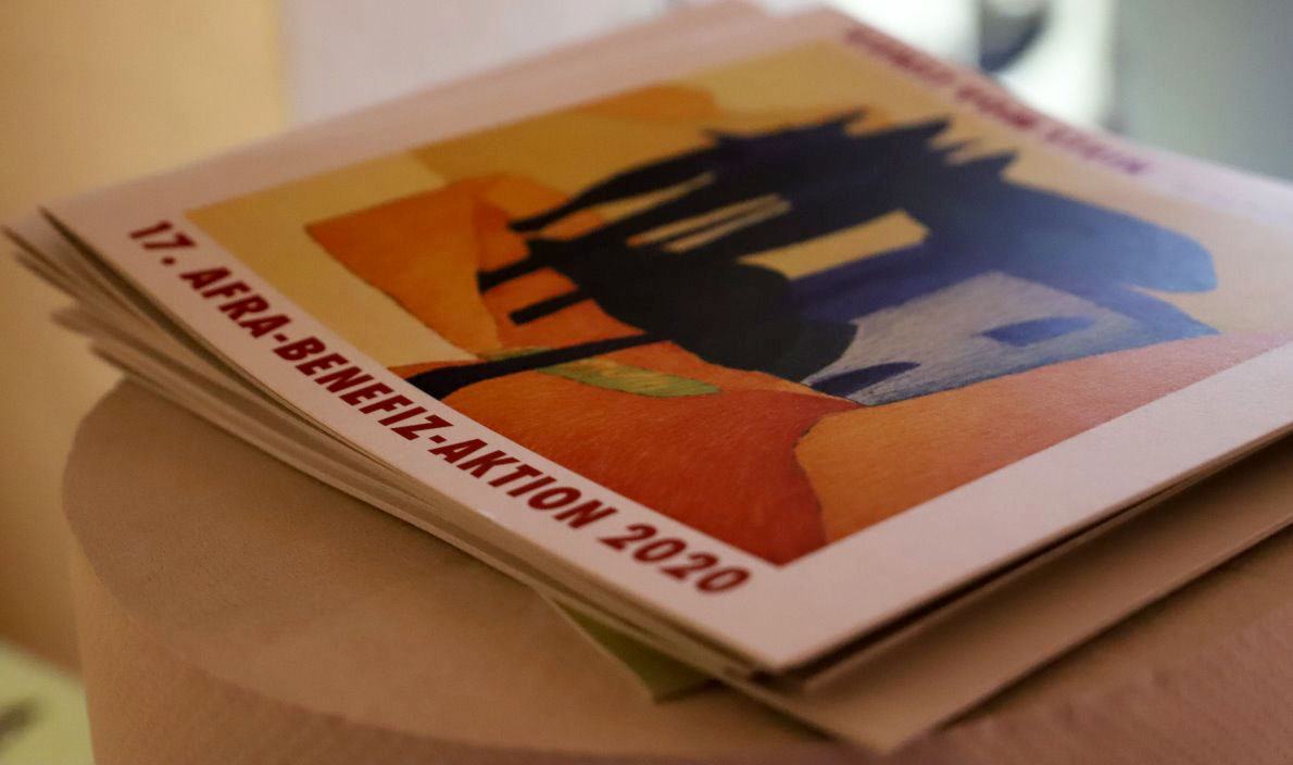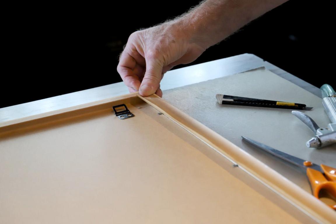 In den Auer’schen Rahmen legt er ein Passepartout und die aktuelle Afra-Lithographie. Er verklebt das Bild mit einem Schutzblatt und dem Zertifikat, unterzeichnet von Veronika Gerber und ihm, dem Steindrucker Günther Stecher. Zum Schluss wird noch ein Nagel fürs Aufhängen eingeklebt.